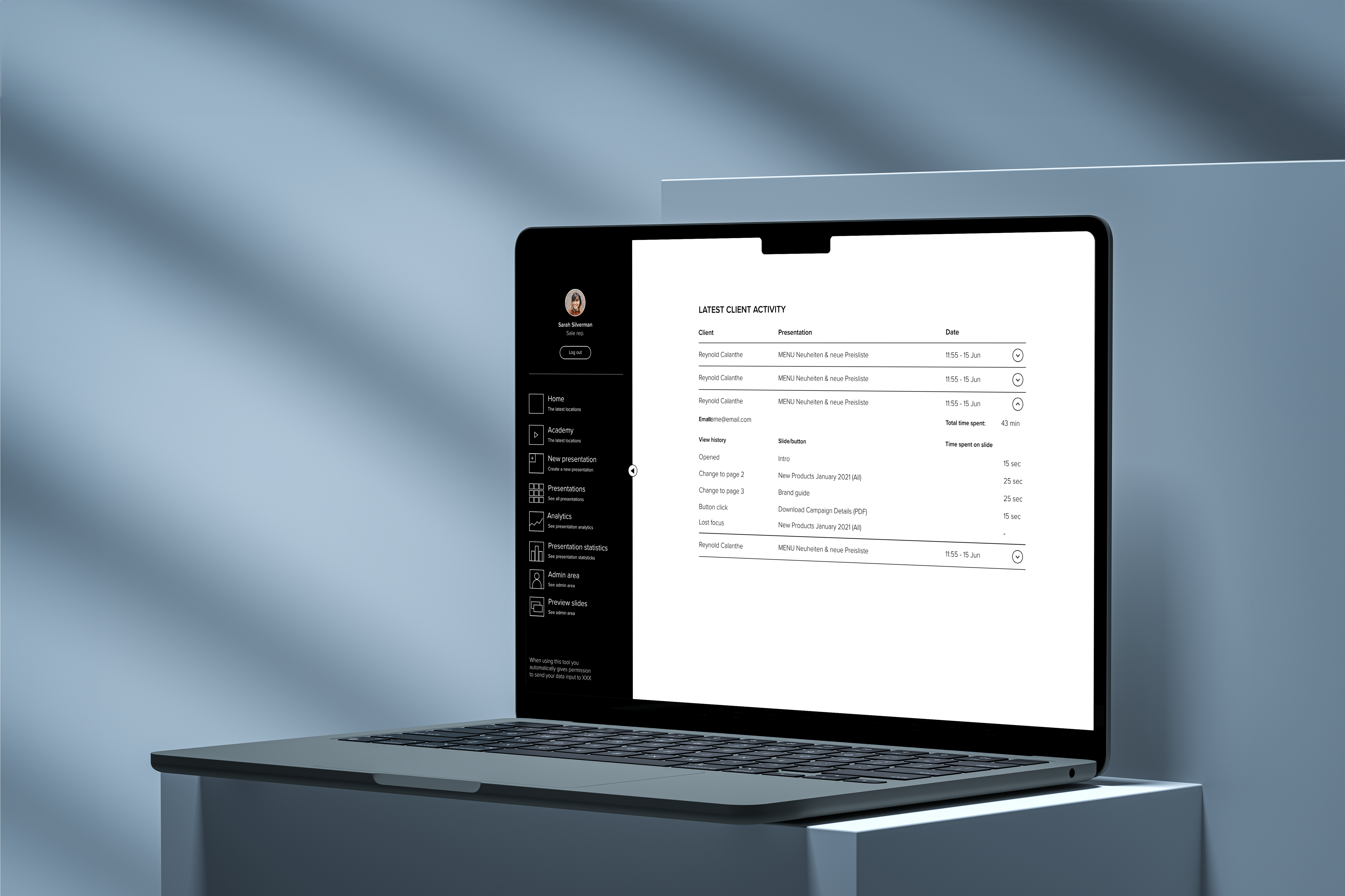 X1 outputs sales presentations as a fully responsive website experience. By sharing an URL to recipients all actions are fully trackable. E.g. when a presentation is opened, if it is shared with someone and if you want to know which slides have been viewed the most. Internally all performance on sales staff and sales content can be monitorized. All tracking is fully GDPR compliant both externally and internally.